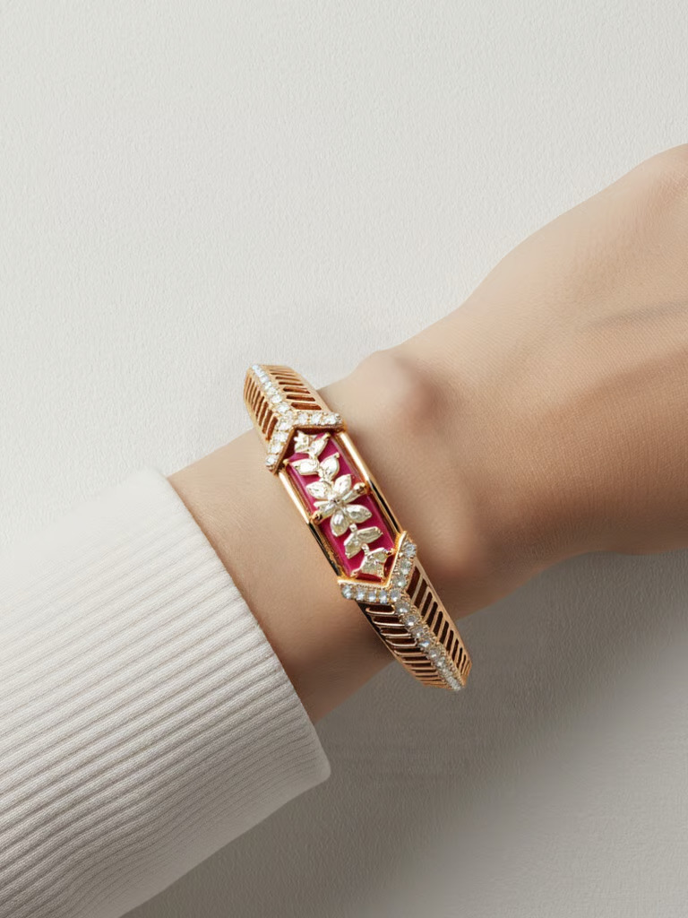 Elevate your look with this luxurious rose gold-tone bracelet, expertly crafted to captivate. The elegant design features a slender, adjustable band, perfectly complemented by a standout rectangular centerpiece embellished with dazzling red stones and graceful floral accents. This exquisite bracelet adds an irresistible pop of color and sophisticated charm to any ensemble, making it an ideal accessory for both special occasions and everyday glamour.