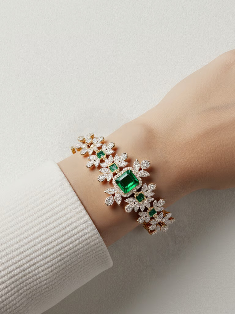Luxurious bracelet with green stone centerpiece and floral motifs