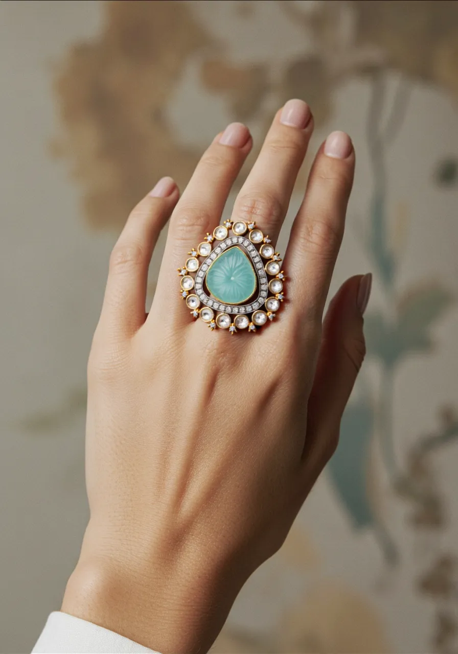 Make a bold impression with this exquisite turquoise statement ring. Showcasing a generously sized teardrop turquoise stone in vibrant hues of blue-green, this ring is beautifully framed by a double halo of luminous pearls and intricate gold detailing. Each piece is expertly handcrafted, giving it a uniquely elegant charm that sets it apart. Perfect for elevating your lookβwhether for a special event or everyday luxury. A true conversation starter, itβs the ideal gift for those who appreciate standout, artisanal jewellery.