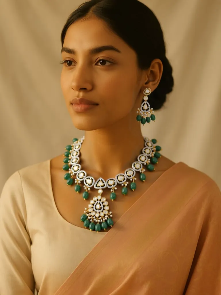 Elevate your traditional ensemble with this stunning Polki Jewelry Set, featuring a statement necklace beautifully encrusted with dazzling white stones and accented by rich, vibrant green beads. The intricately designed necklace is paired with matching drop earrings for a complete, elegant look, making it an ideal choice for weddings, festivals, parties, and other special occasions. Expertly hand-crafted, this versatile set enhances the grace and sophistication of sarees, lehengas, and other ethnic outfits. Make a lasting impression with this timeless accessory.
