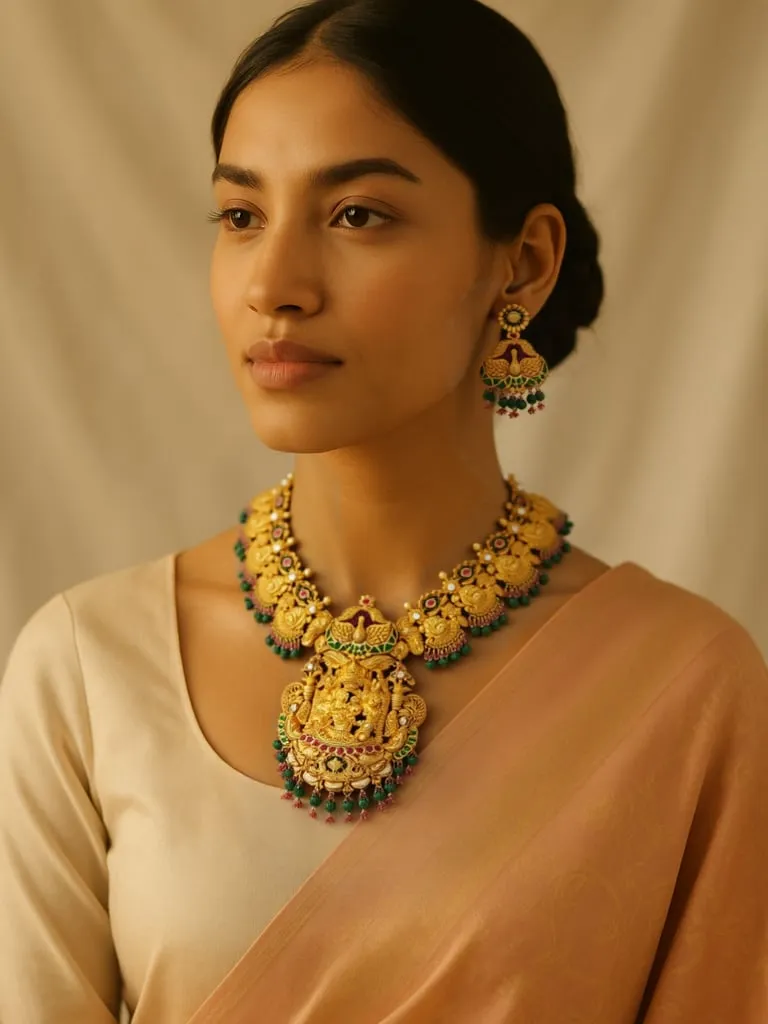 Elevate your festive look with this exquisite traditional temple jewelry set, featuring a beautifully crafted necklace and matching earrings. Each piece showcases intricate temple-inspired designs, meticulously detailed to capture the essence of timeless Indian artistry. Accented with striking green embellishments, this set adds a vibrant touch to any traditional attire, making it ideal for weddings, religious ceremonies, or special occasions. Available in antique gold with rich green highlights, this set promises both elegance and enduring charm.