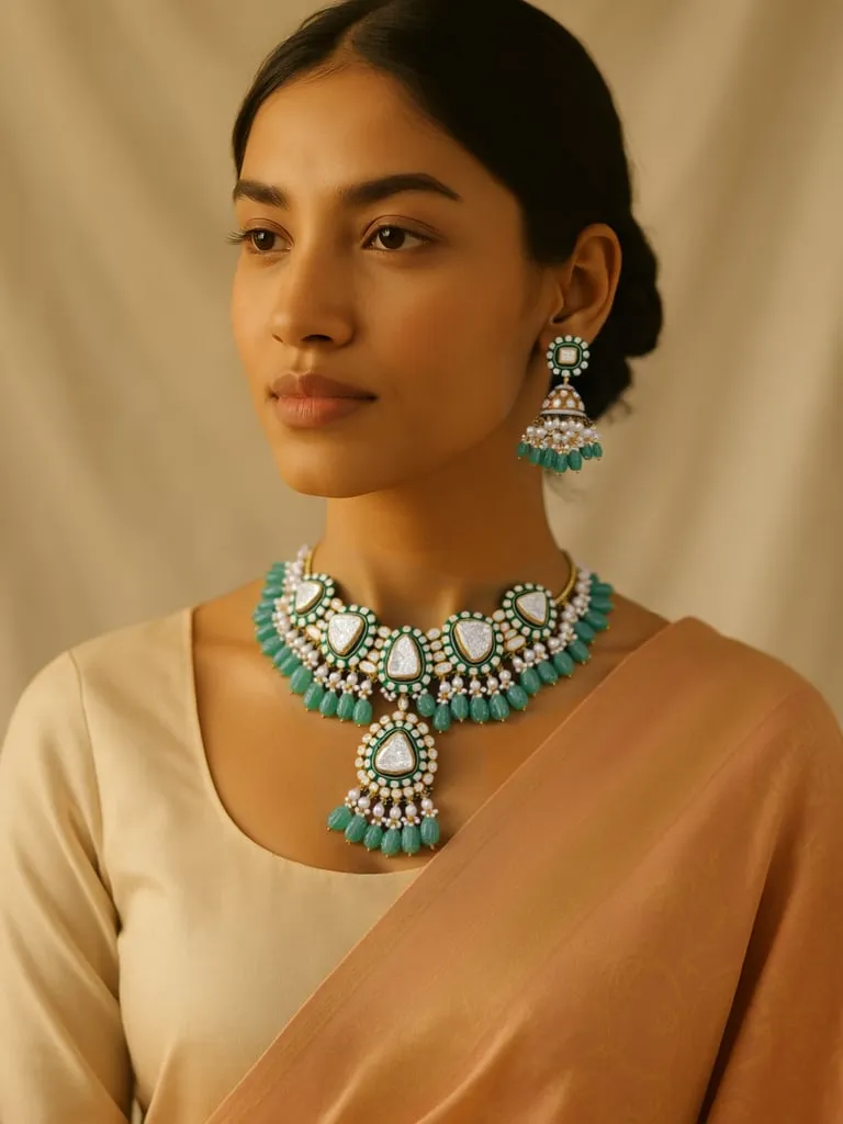Elevate your elegance with this stunning turquoise and pearl statement necklace set, expertly crafted to add a touch of sophistication to your traditional ensembles. The set includes a bold necklace and matching drop earrings, each featuring vibrant turquoise beads, lustrous white pearls, and finely detailed gold accents. The rich colors beautifully complement both festive and casual ethnic wear, making it a versatile addition to your jewelry collection. Hand-crafted to perfection, this set offers an exquisite blend of tradition and contemporary charm.